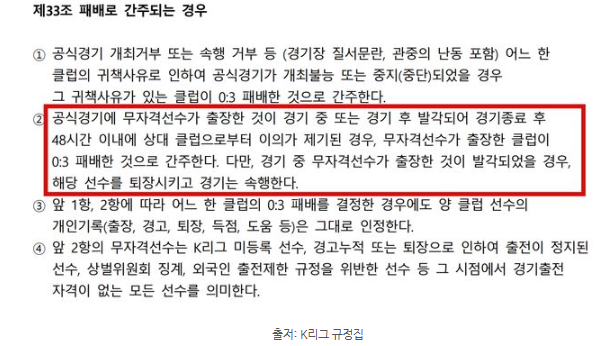 K리그 규정 제33조 2항은 공식경기에 무자격선수가 출장한 것이 경기 중 또는 경기 후 발각돼