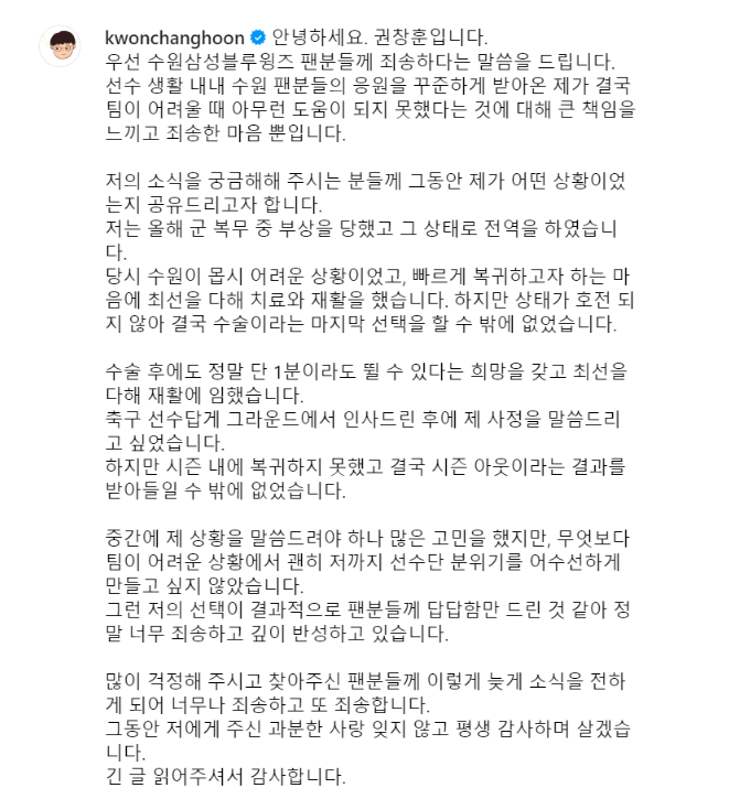 권창훈: 수원 어려울 때 아무 도움 되지 못해 죄송해"