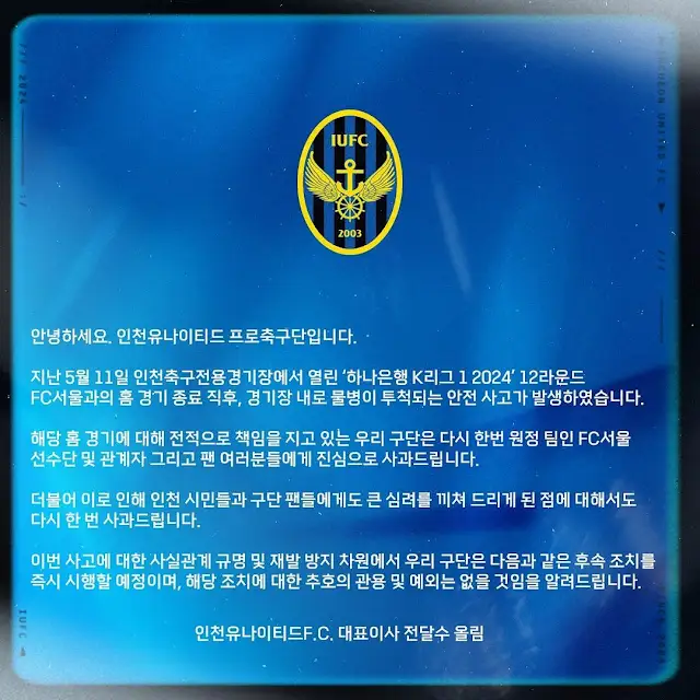 인천 유나이티드 전달수 대표이사는 이날 사과문에서 "해당 홈 경기에 대해 전적으로 책임을 지고 있는 우리 구단은 다시 한번 원정팀인 FC서울 선수단 및 관계자 그리고 팬 여러분들에게 진심으로 사과드린다"라고 밝혔다.