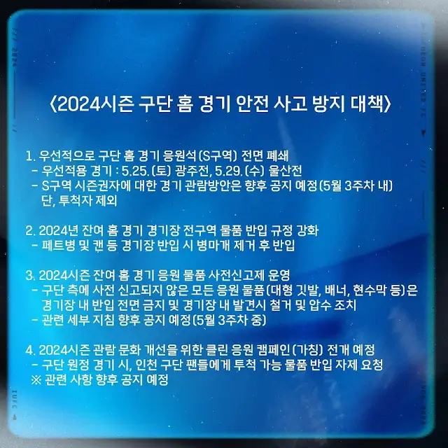 이와 관련해 구단 측은 물품 반입 규정을 강화하고 경기장 전 구역에서 입장 시 보안 검색도 철저히 하겠다고 밝혔다.