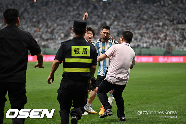 이날 메시의 모습을 보기 위해 베이징에 6만 8천 여명의 관중이 몰렸다. 경기 중 한 중국 남성팬이 메시를 보기 위해 그라운드에 달려 들었다가 공안에 체포되는 불상사가 벌어졌다. 팬이 어깨동무를 하자 메시는 불편한 표정을 지었다. / jasonseo34@osen.co.kr