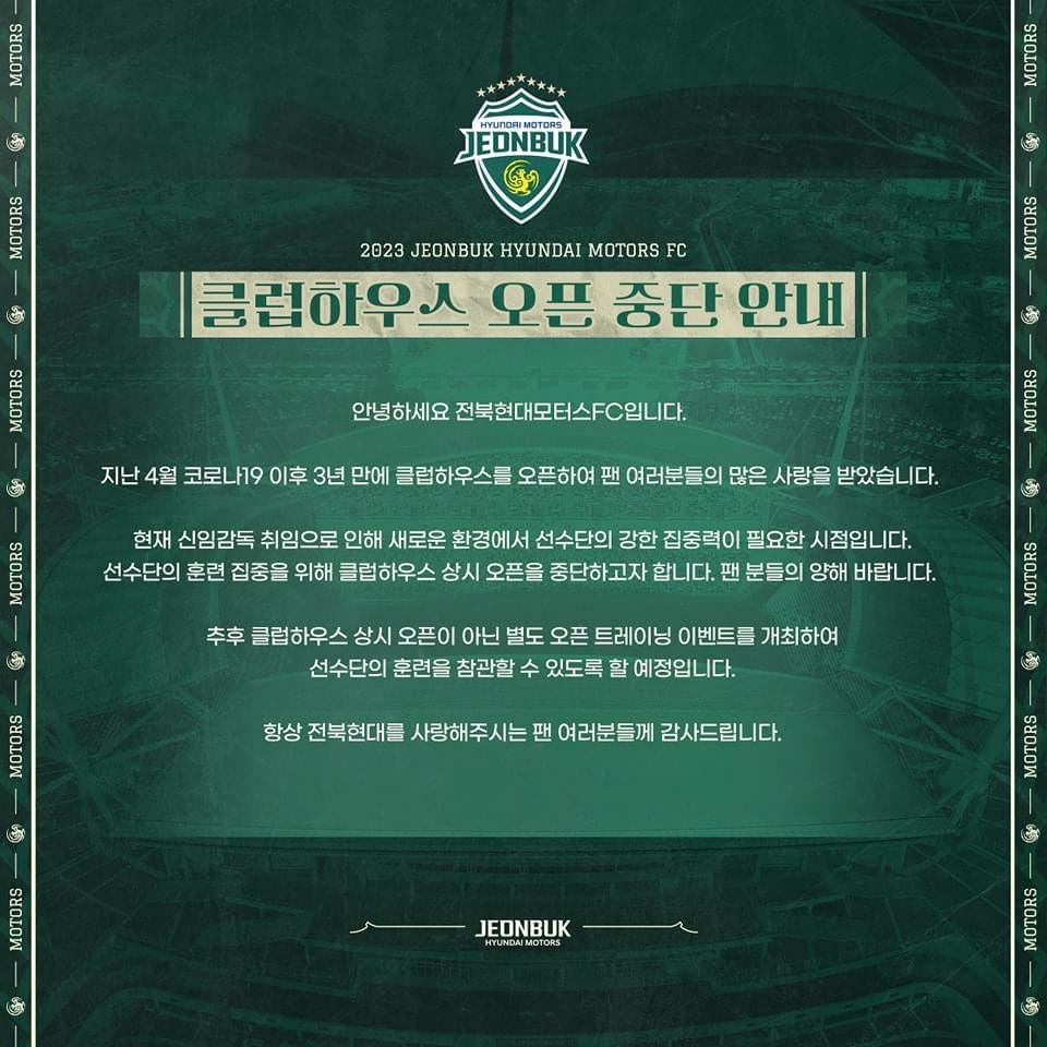 현재 신임감독 취임으로 인해 새로운 환경에서 선수단의 강한 집중력이 필요한 시점입니다. 선수단의 훈련 집중을 위해 클럽하우스 상시 오픈을 중단하고자 합니다. 팬 분들의 양해 바랍니다
