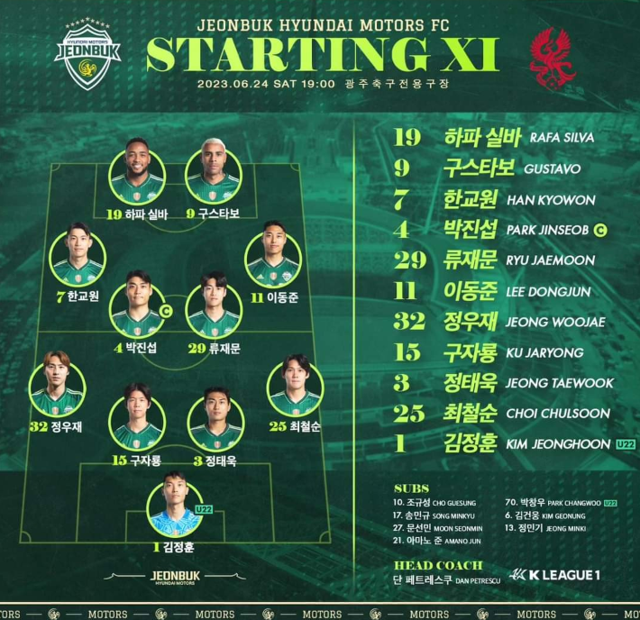 김진수·김문환·백승호·홍정호 등 줄부상 악재 28일 FA컵서 광주와 또 만난다 전북현대 새로운 감독대행 루마니아 출신 페트레스쿠 전북감독 첫경기 완패 이정효 감독이 전북전에 잘 대비했다.