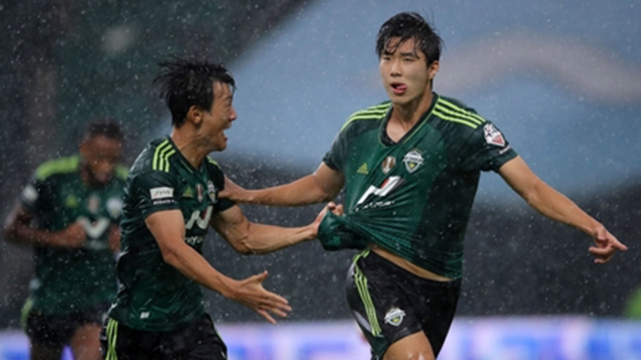 폭우로 인한 경기 속에서 득점포를 올린 박재용선수가 첫 홈에서 득점을 하였다.