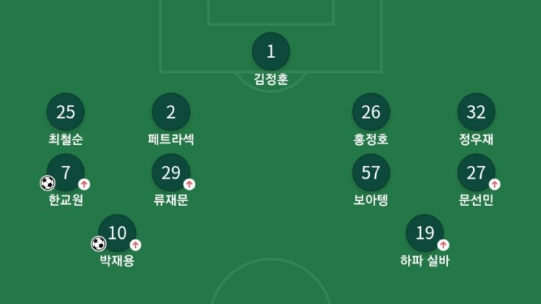 좌우 윙어에는 전진우 선수, 김주찬 선수가 구성하고 있습니다.